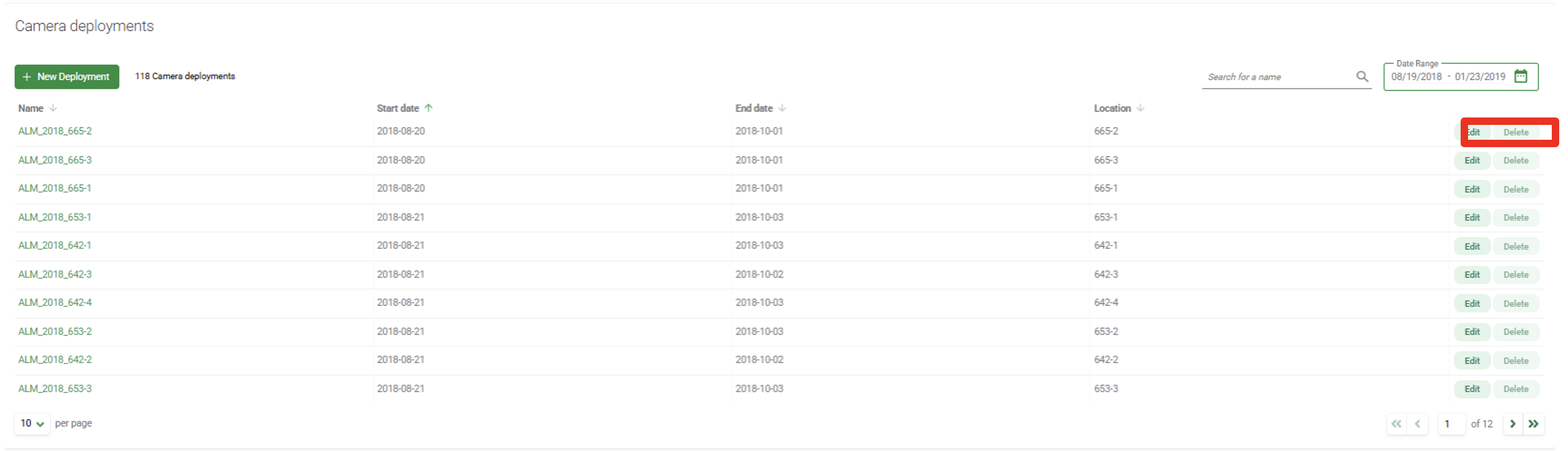 Search for a camera deployment by name by typing in criteria in the search box in the right-hand corner of the camera deployments table.