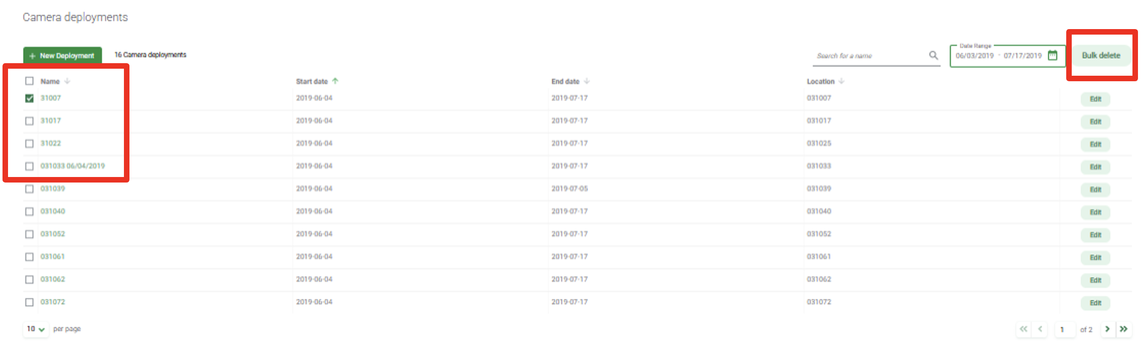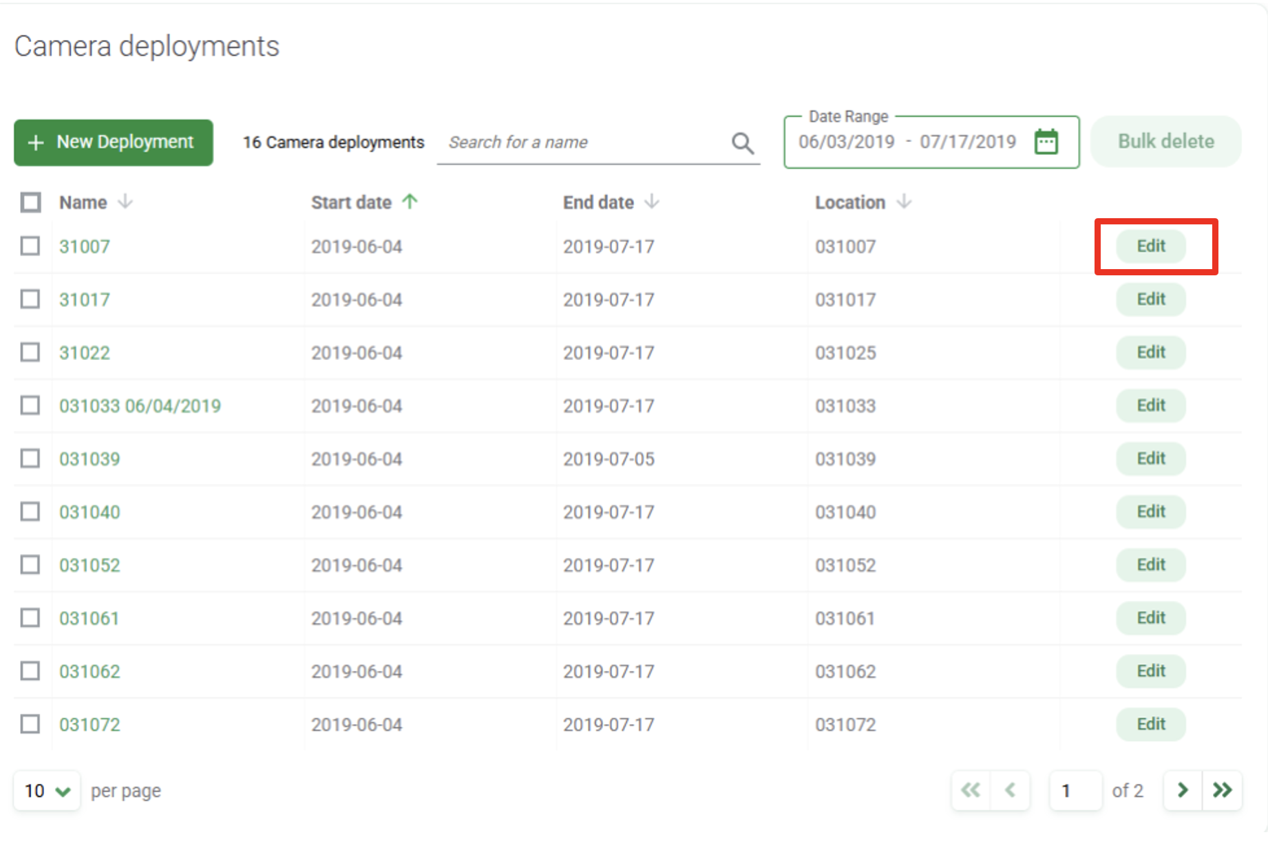 To delete a camera deployment, you must be a Project Owner or Editor. Click the green Delete button to the right of the camera deployment record. If you are a Project Owner, you can delete multiple camera deployments at once by selecting the camera deployments to delete and clicking the green Bulk Delete button.