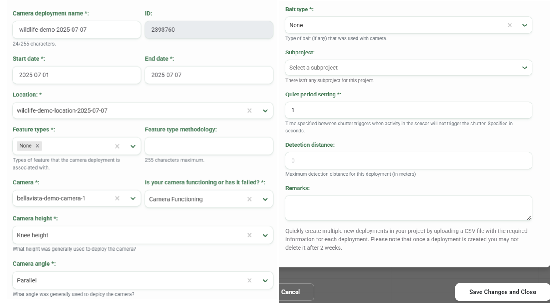 - Remarks - Any other notes about the deployment. Note: These remarks are available in the public download from Wildlife Insights.