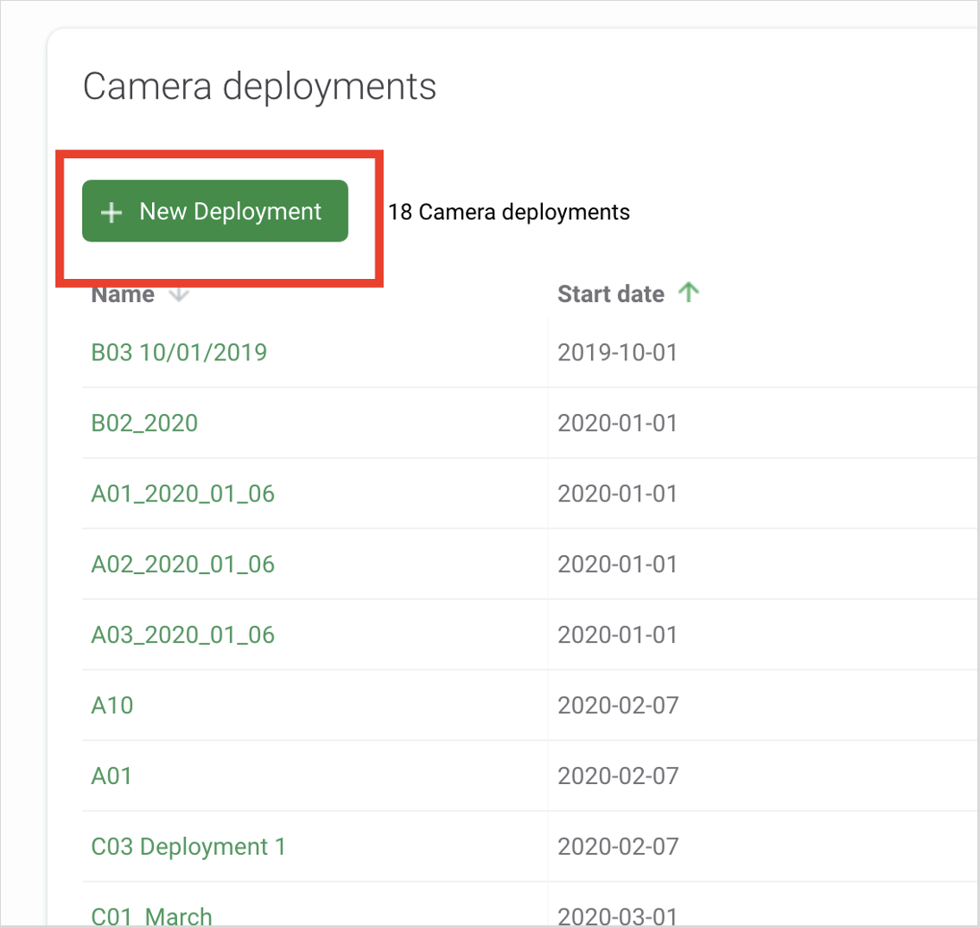 There are a variety of ways to help you sort and filter your camera deployments. Simply click on the arrow next to a column header to sort by that column.