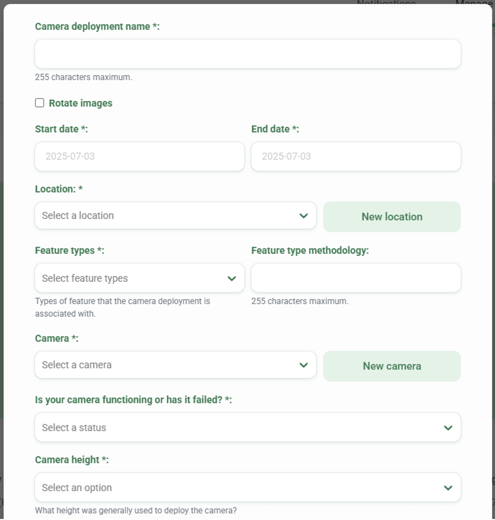 - Feature types* - Select the type of physical feature, such as burrow, nest site, or water source, that the camera deployment is associated with. If the deployment is not associated with a specific feature type, select None.